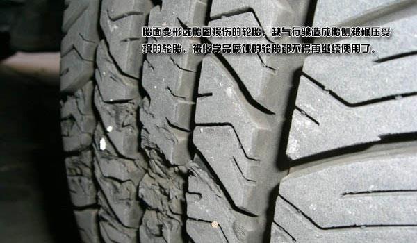 3、胎面变形或胎圈损伤的轮胎,缺气行驶造成胎侧被碾压受损的轮胎,被化学品腐蚀的轮胎都不得再继续使用了。