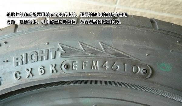 1、轮胎上的商标都是用英文字母标注的。正品的轮胎的商标字母很清晰,方便辩识。小心留意轮胎商标,不要购买到假冒轮胎。
