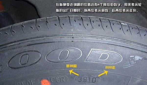 2、在胎侧靠近钢圈的位置会有4个阿拉伯数字,用来表示轮胎的出厂日期的。前两位表示周数,后两位表示年份。比如“0814”就表示这个轮胎的出厂日期是在2014年第8周。