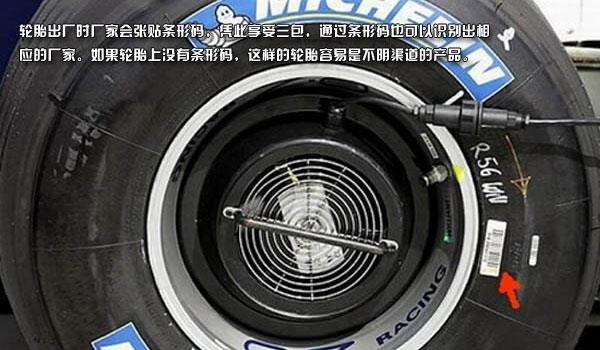 3、轮胎出厂时厂家会张贴条形码,凭此享受三包,通过条形码也可以识别出相应的厂家。如果轮胎上没有条形码,这样的轮胎容易是不明渠道的产品。