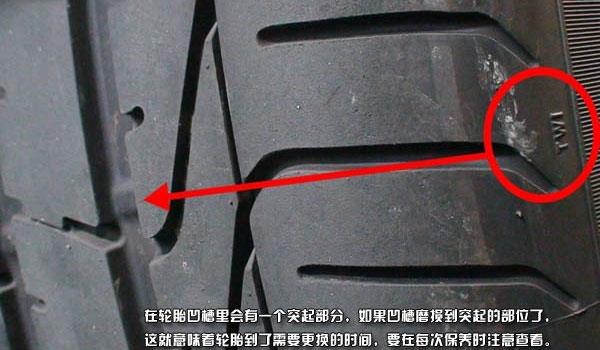 4、在轮胎凹槽里会有一个突起部分,如果凹槽磨损到突起的部位了,这就意味着轮胎到了需要更换的时间,要在每次保养时注意查看。
