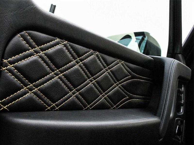 门板的做工细腻,用料扎实,为了配合整车的内饰配色风格,内侧都换成了真皮配合金色缝线也就起到了画龙点睛的效果,手感也是非常不错的。现在这种撞色搭配缝线工艺在改装中非常常见。