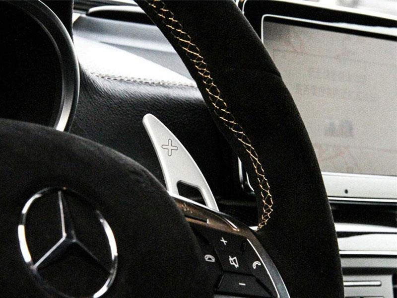 方向盘是Alcantara(翻毛皮)材质包裹,巴博斯铝制换挡拨片装在方向盘后侧的左边10点位置和右边2点的位置,左边的拨片上会标有“-”符号,表示减挡;右边的拨片全标有”+“符号表示加挡,通过方向盘上的这两个拨片可以让驾驶者在双手不离开方向盘的情况下轻松实现加减挡。