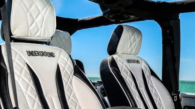 牧马人原装的车顶和车门均已不复存在,而是使用粗壮的钢管防滚架当车顶,细钢管和钢板焊接而成的车门。前挡风玻璃上方升级了一套LED辅助灯组,升高的悬架改装、更大尺寸的车轮以及前杠,大大提高了牧马人的越野通过性。